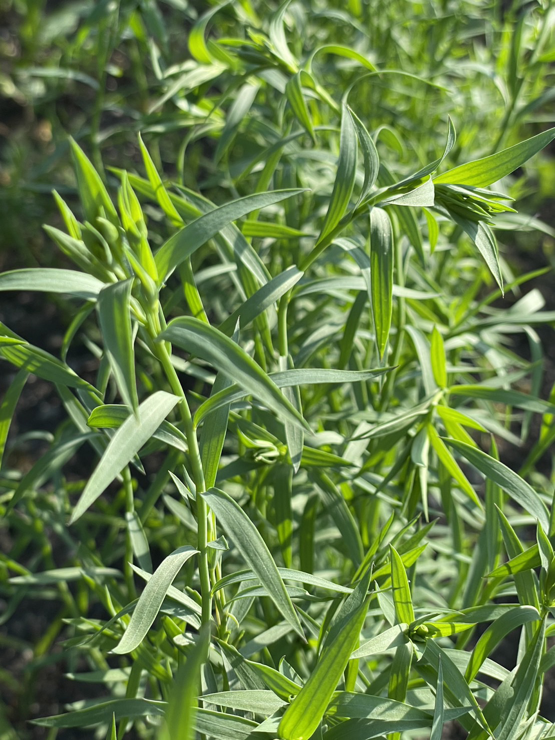 未だグリーン一色で、つぼみを沢山付けて、開花初日を待つ、亜麻達。