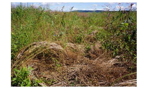 収穫した亜麻を、ハウス内で“地乾し”し、その後雑草の種等も混合なので、