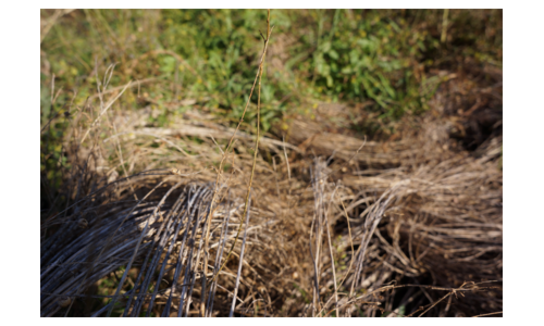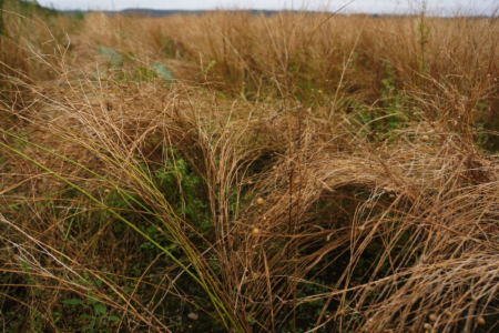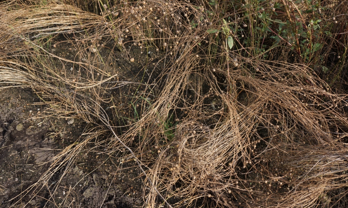 収穫した亜麻を、ハウス内で“地乾し”し、その後雑草の種等も混合なので、