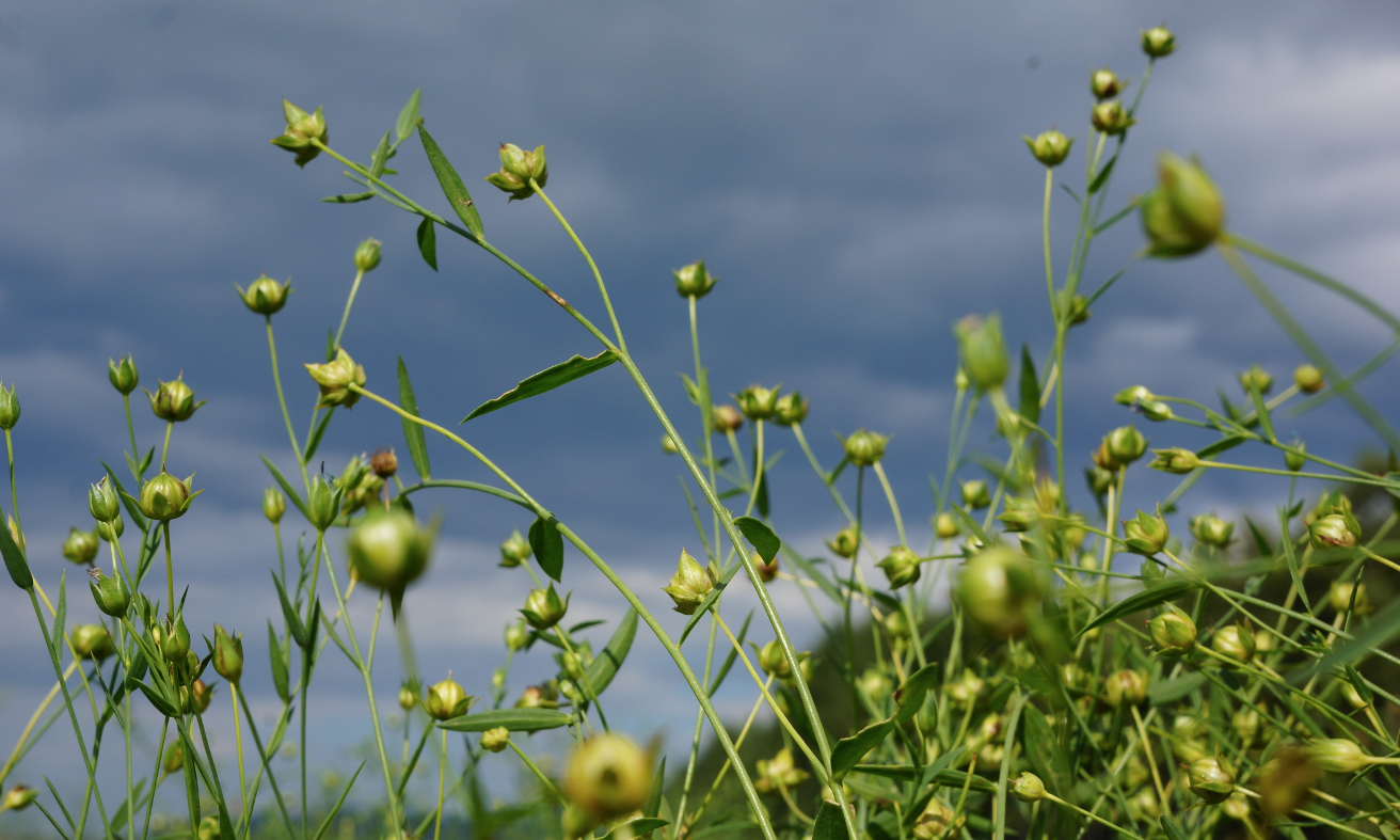 未だグリーン一色で、つぼみを沢山付けて、開花初日を待つ、亜麻達。