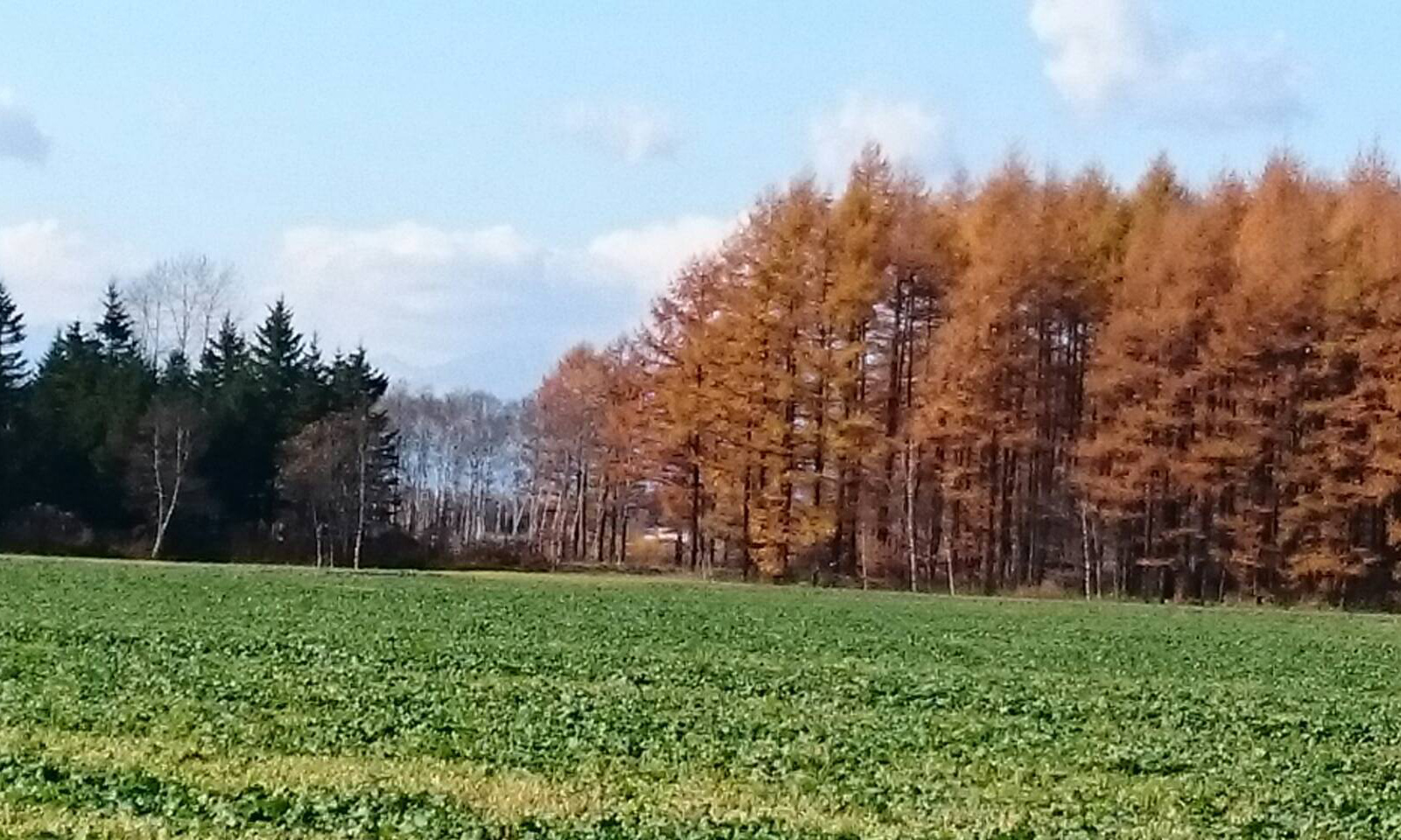 水色の空と未だ茶色の落葉松(カラマツ)、